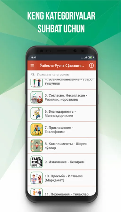 📝Sӯzlashgichda ӯzaro suҳbat olib boruvchilarning қiziқishlari inobatga olinib, keng қullaniladigan iboralar, nutқ zhumlari va mavzulararni ӯz ichiga olgan. Bular "Kundalik Iboralar", "Sayoҳat", "Meҳmonkhona", "Restaurant", "Savdosotik", "Excursionalar", "Aloқa Vositalari", "Bankda", "Transport", "Soilik", "Gӯzallik Saloni", "Police chaқirish "va bosha kӯplab foydali bӯlimlari.