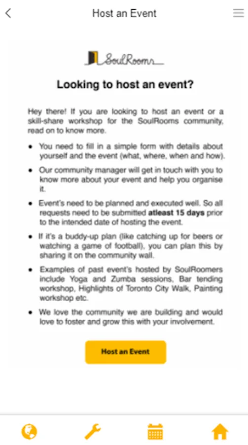 SoulRooms is a co-living company and the app is a community engagement mobile application for the tenants of SoulRooms (referred to as SoulRoomers). The members can chat with each other, raise maintenance requests for the apartments, indulge in community events and activities, host events and skill share workshop for community members, view exclusive deals for SoulRoomers and weekly recommendations on bars, restaurants, movies, OTT, travel etc.