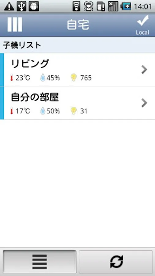 子機リスト画面では設置場所の温度、湿度、照度センサーの値を一覧で確認することができます。