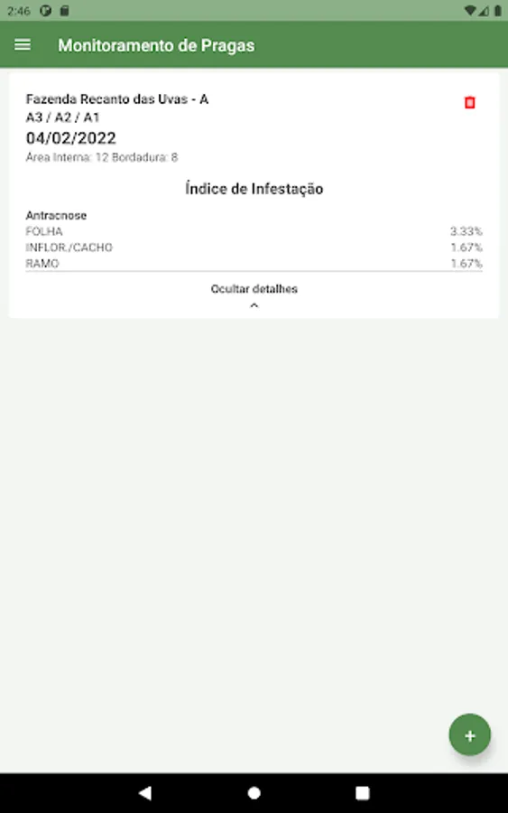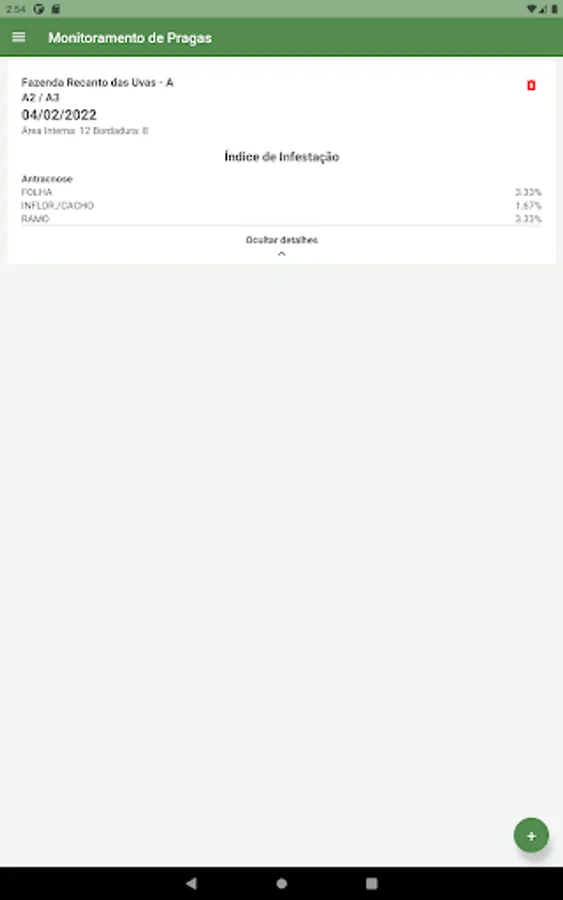 The application allows sending the collected data to the Caderno de Campo online system, where they will be interpreted to generate practical and objective reports, aiming at better control of labor, pests and the quality of work.