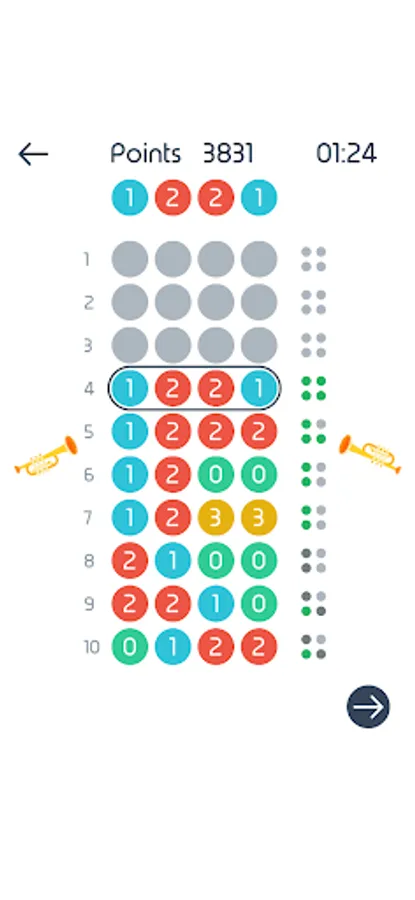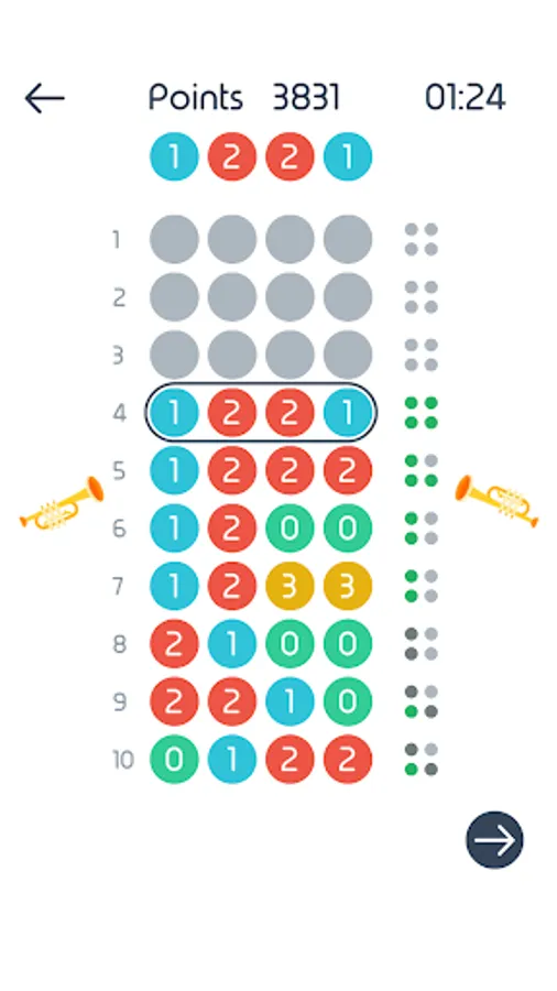 - Very easy: the code composed of 4 figures is formed by combining 4 colors. You have 10 attempts to solve it.