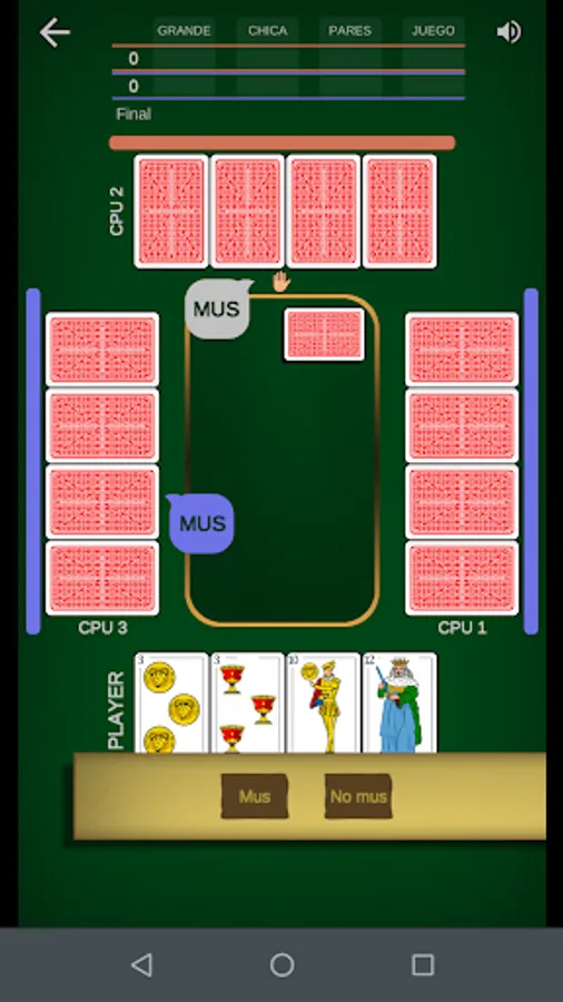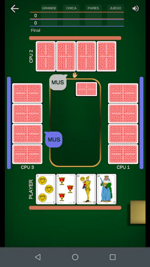 The Mus is a game of 4 players in pairs. It is played with the 40 cards of the Spanish deck. There are two peculiarities regarding the composition of the deck: the four threees of the deck will be held by kings and the four twos of the deck will be considered as aces.