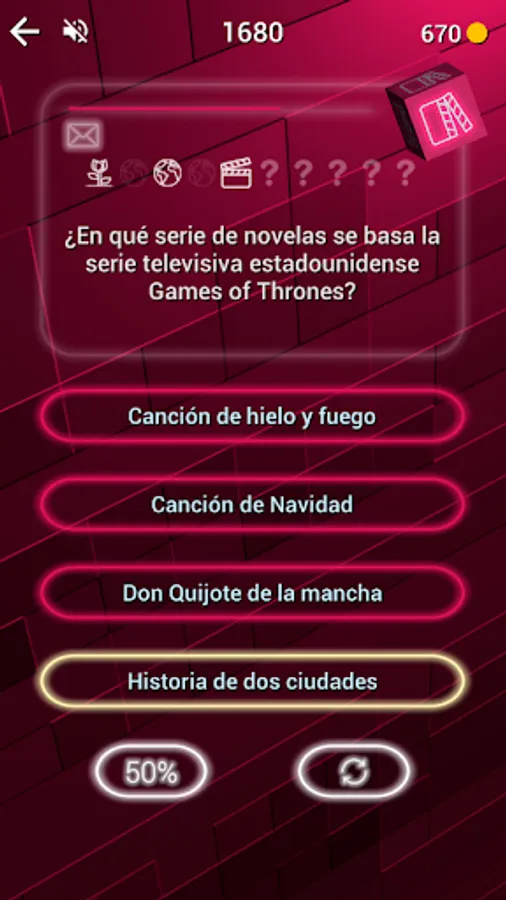 Before each question the 3D dice must be thrown and the subject of the question will be determined. Each of the 6 faces of the 3D die identifies a theme: Geography, Entertainment, History, Art and Literature, Science and Nature, Sport and leisure. Each question has four options to choose from as an answer.