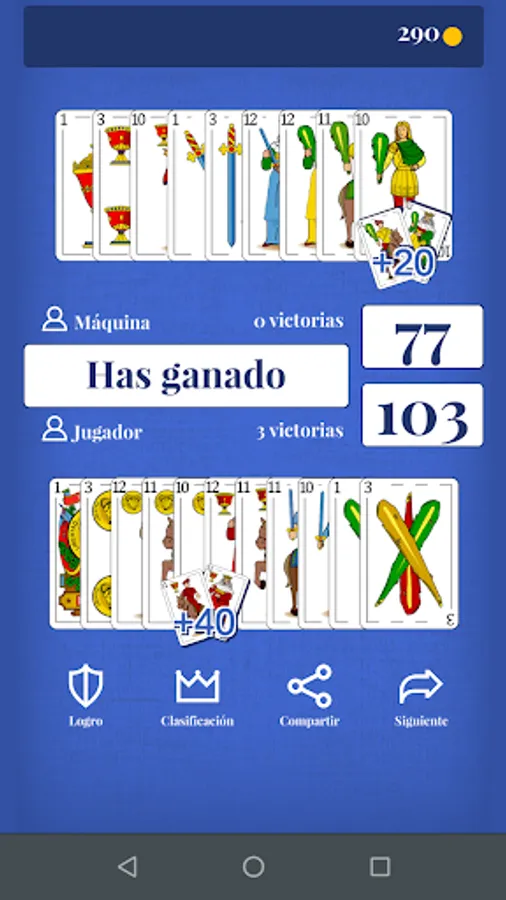 - Each player gets the sum of the points obtained with the cards of the rounds won, plus the points of the chants.