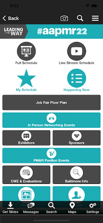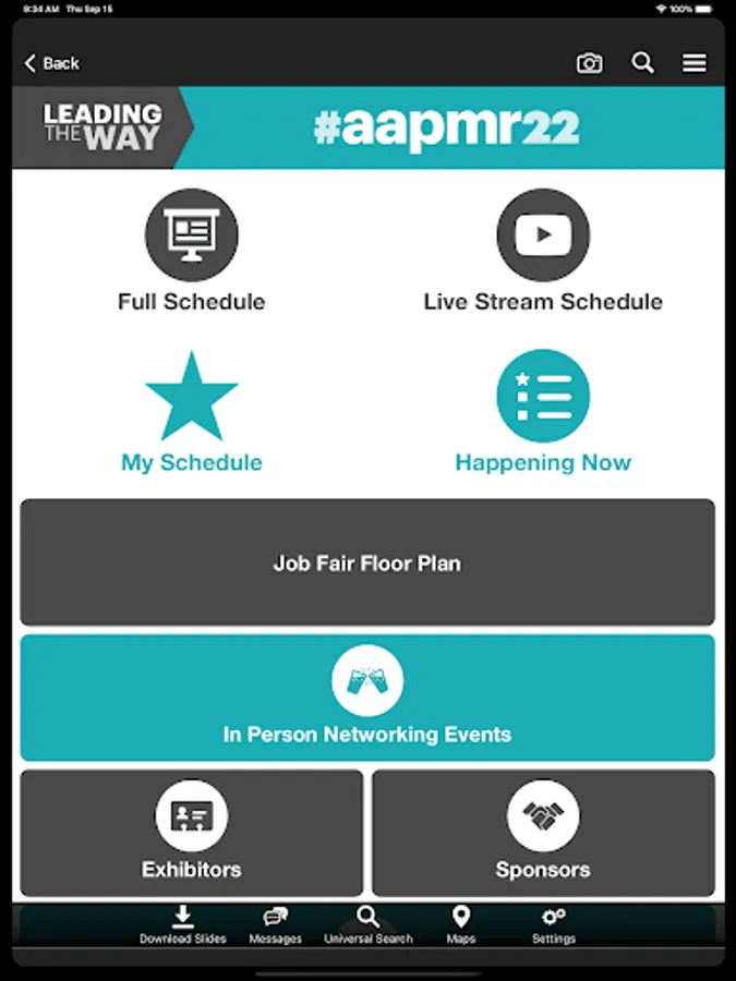 The AAPM&R Events mobile application allows you to view the schedule, exhibitors and speaker details from the annual conference. Users can take notes adjacent available presentation slides and draw directly on slides inside the app. Note-taking is also available in the Exhibitors modules.