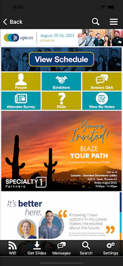 The AAE Meetings mobile application allows you to access AAE's various conferences. Within the underlying event apps, users can access presentations, exhibitors, and connect with other attendees. Users can also take notes adjacent available presentation slides and draw directly on slides inside the event apps.