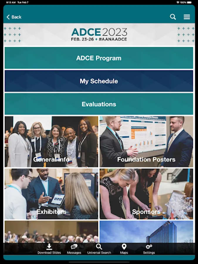 The AANA Meetings mobile application allows you to access this organization's various conferences. Within the underlying event apps, users can access presentations, exhibitors, and connect with other attendees. Users can also take notes adjacent available presentation slides and draw directly on slides inside the event apps.