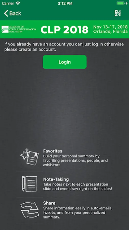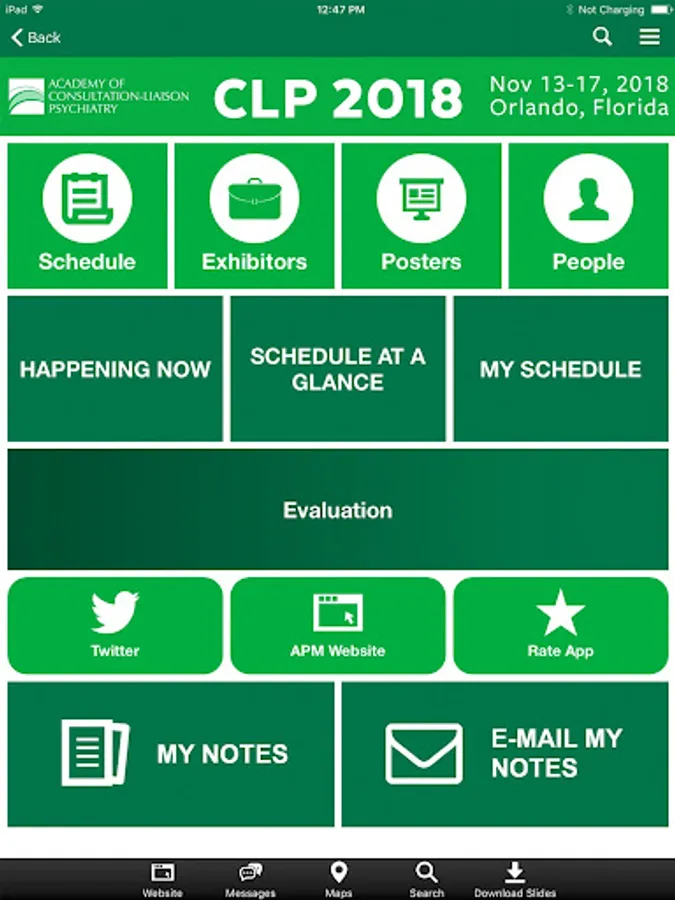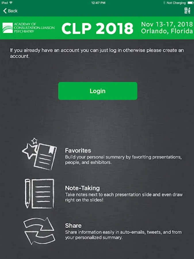 The ACLP Events mobile application allows you to access this organization's various annual conferences. Within the underlying event apps, users an access presentations, exhibitor data, posters, and connect with other attendees. Users can also take notes in adjacent available presentation slides and draw directly on slides inside the event apps.