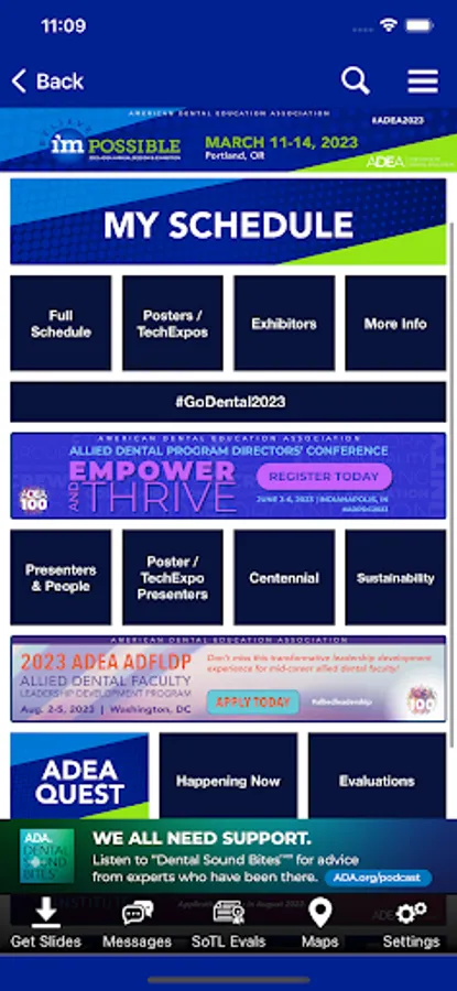 The ADEA LIVE mobile application allows you to access this organization's various conferences. Within the underlying event apps, users can access presentations, exhibitors, and connect with other attendees. Users can also take notes adjacent available presentation slides and draw directly on slides inside the event apps.