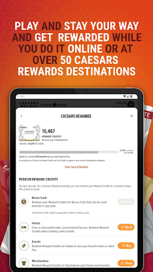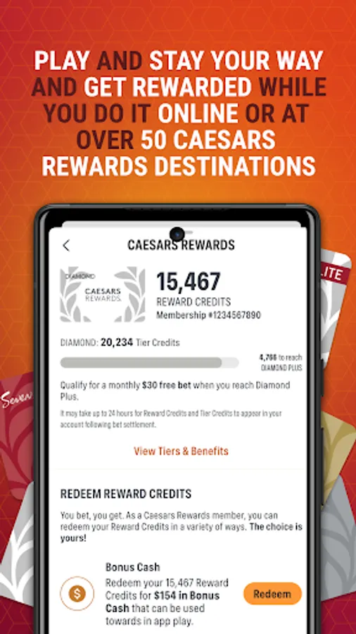 Embrace the same rewarding experience you've come to love by playing online, where every wager you make will earn you both Reward Credits and Tier Credits. You can easily redeem your Reward Credits online or at any of our 50+ Caesars Rewards destinations.
