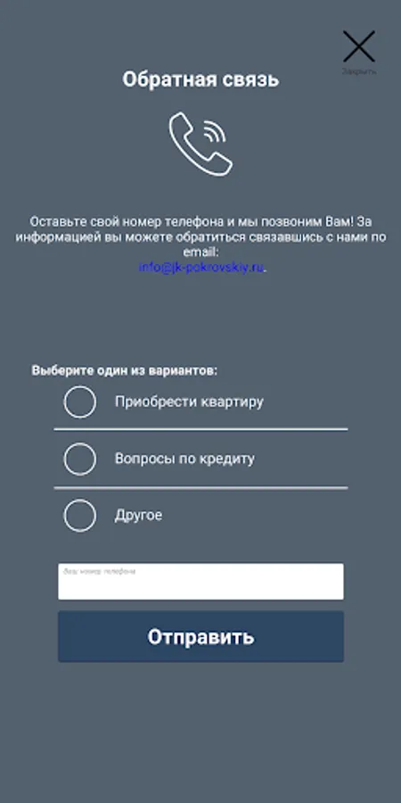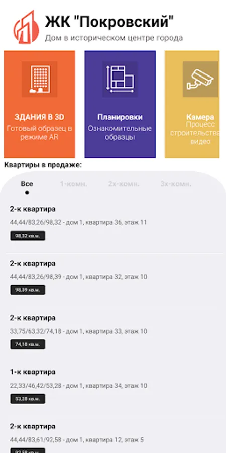 LCD "Pokrovsky" - an innovative application that uses augmented reality (AR) for quick visualization of a building object. AR Augmented Reality technology allows you to use 3D objects and place them in space. The application for choosing your own apartment easily proves this. We provide complete and concise information about the residential complex and apartments in a building under construction in the city center. Always up-to-date information in your application.