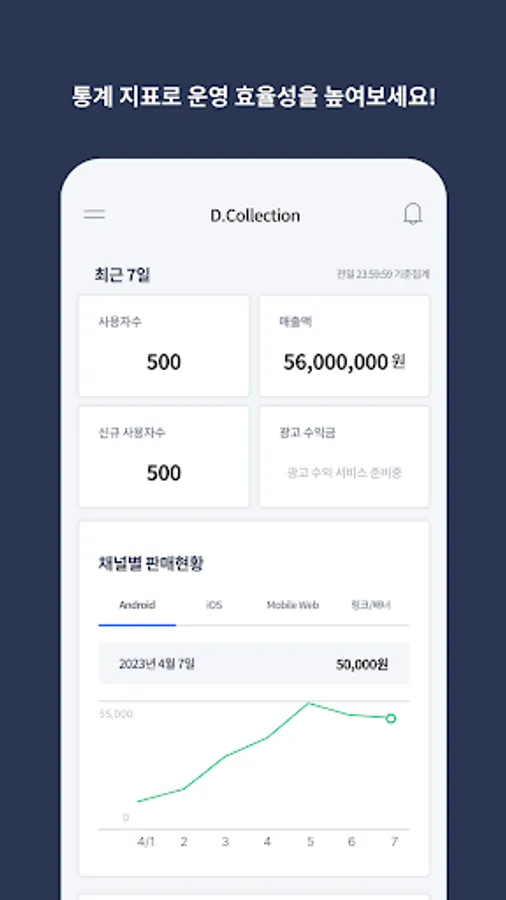You can check statistical indicators for the number of users, sales, sales status by channel, and total visit index for the last 7 days.