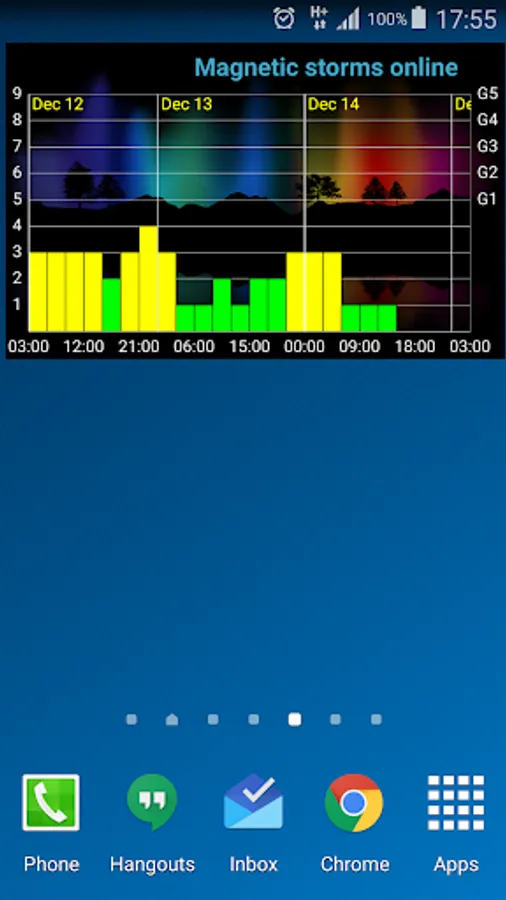 All four graphs are available as widgets, and there is also a widget displaying the current geomagnetic index on a scale from 0 to 9.