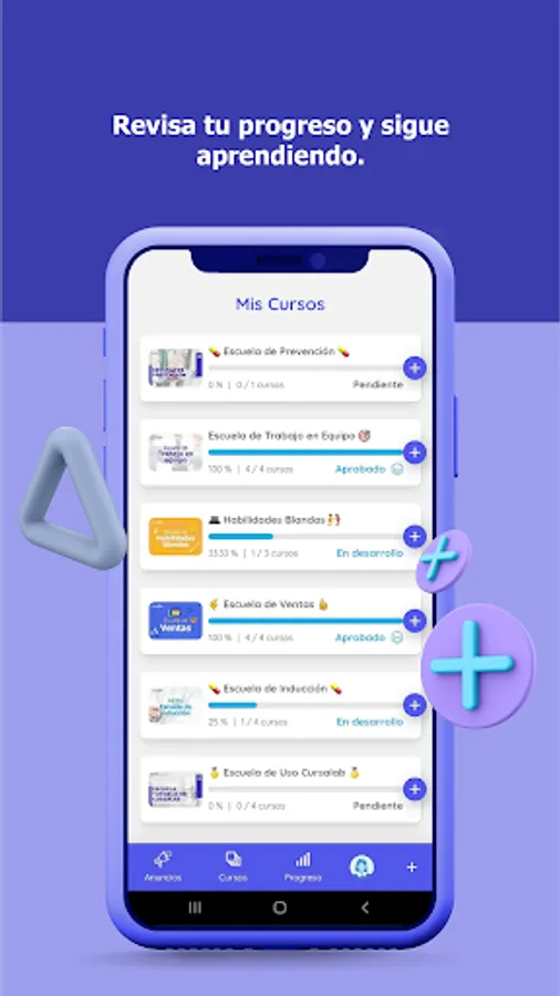 You will be able to look at your assigned courses, complete your evaluations, find out about the latest announcements, connect to live sessions with Cursalive, see your progress, review your ranking by categories, take satisfaction surveys, send your assigned tasks and many more activities. 馃ぉ