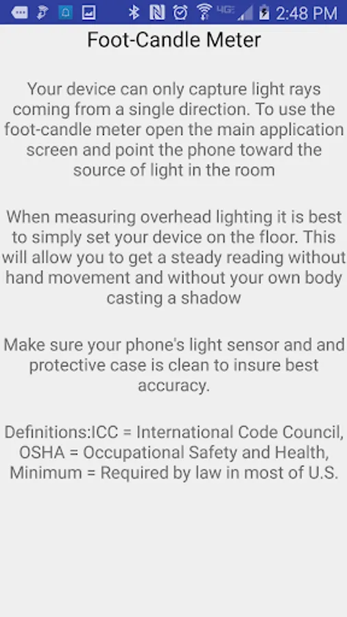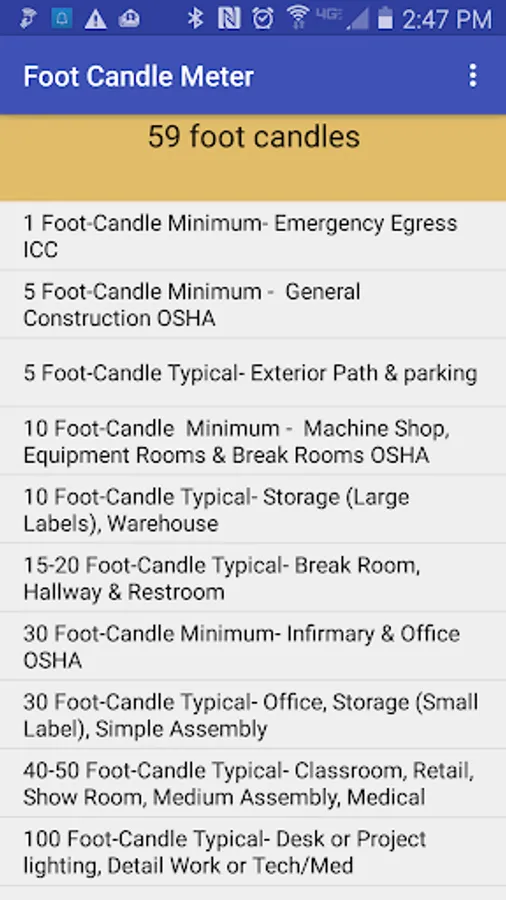 This app uses your phones light sensor to give you a quick reading of the foot-candle measurement. The app also includes a reference to the foot-candle guidelines created by OSHA, the ICC as well as a general reference for correct light levels for different working environments.
