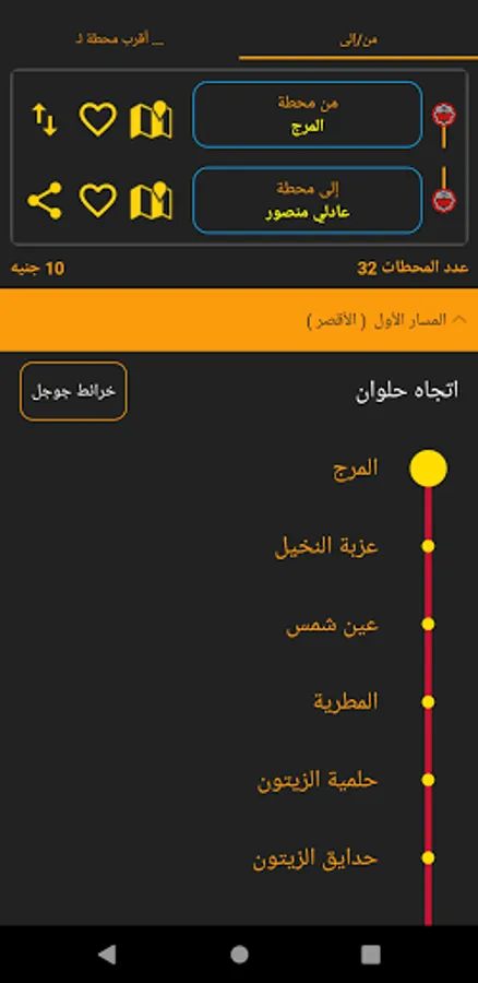 * أيضاً يخبرك التطبيق بالمحطات التي سوف تمر بها عند اختيار خاصية من/إلى.