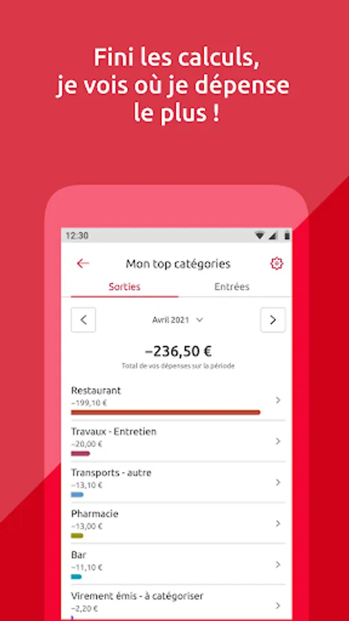 - Optimize the management of your budget. With the "categorization of transactions", "the top categories of expenses", "inflows and outflows of money", you can more easily identify the movements of your account and the most expensive budget items.