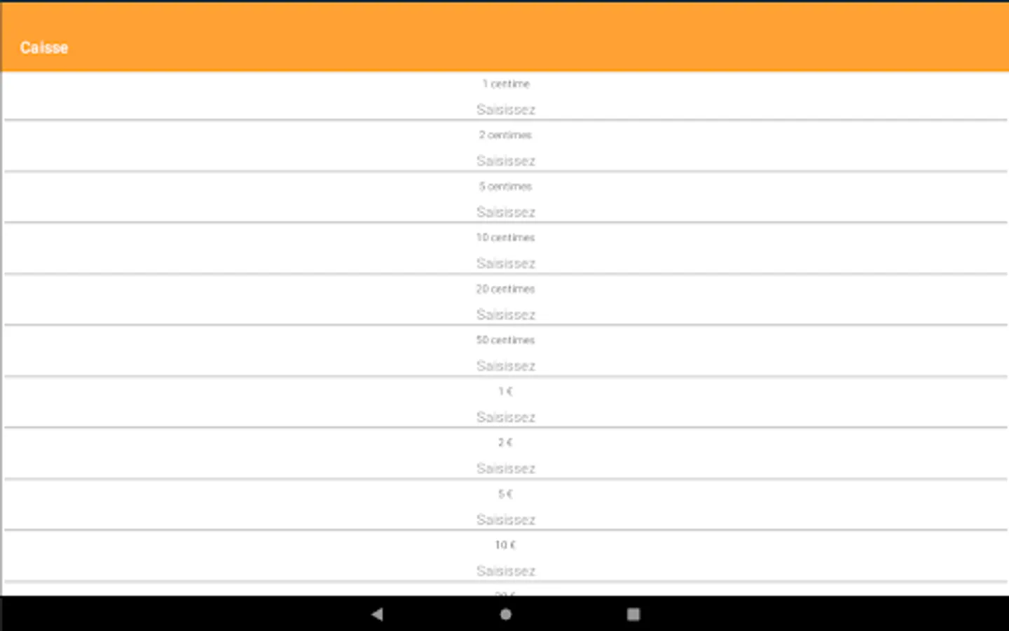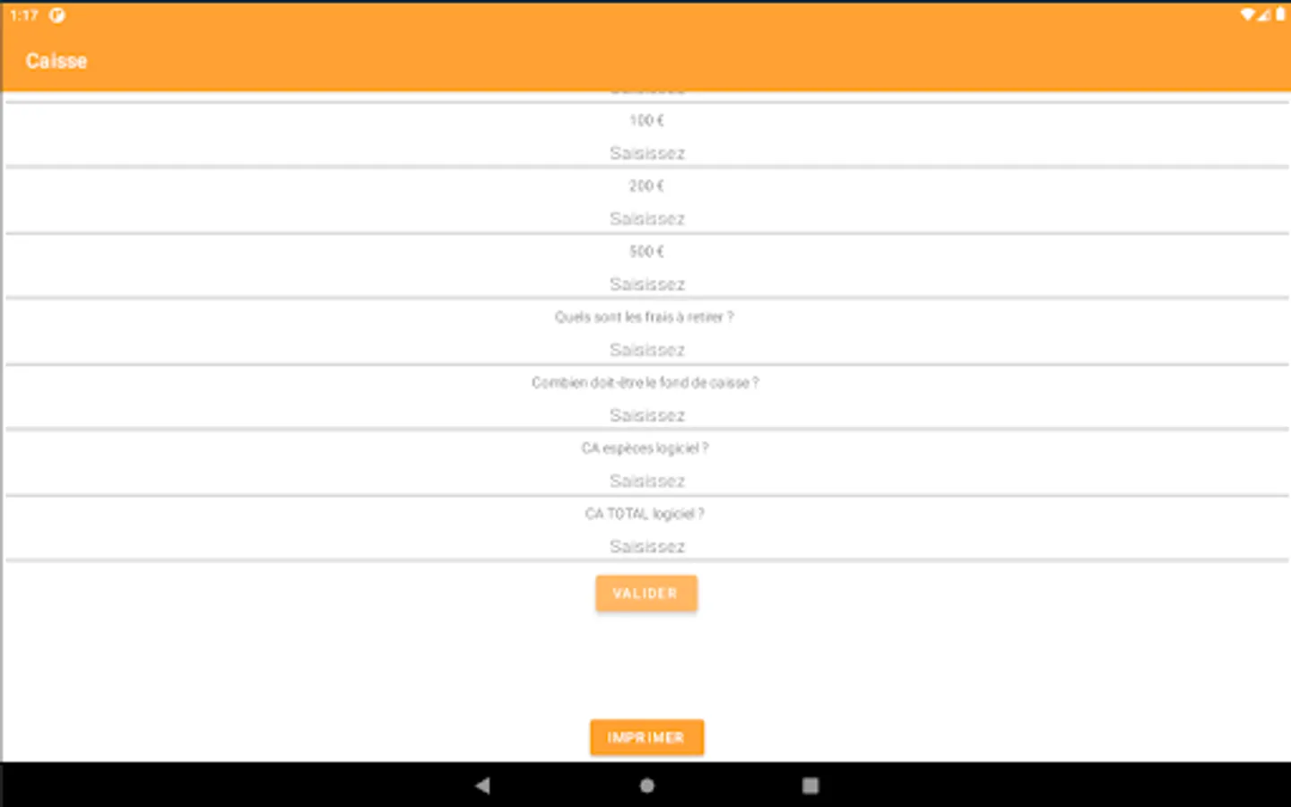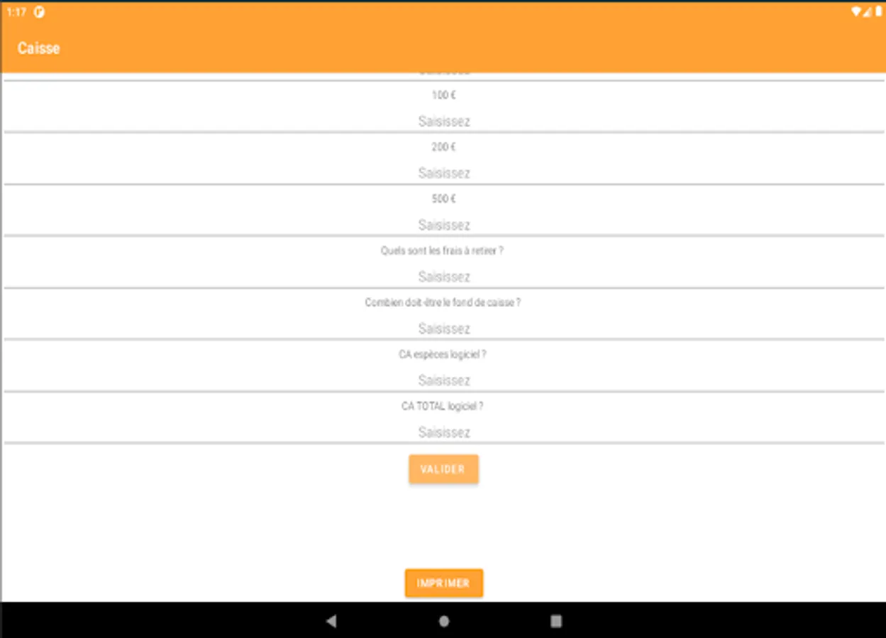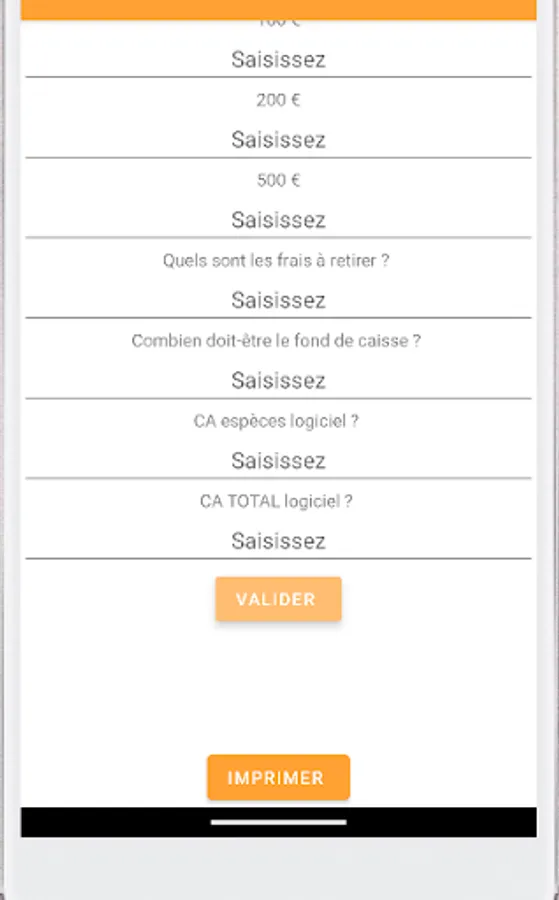 This application makes it possible to calculate the cash register (Sum of cents, banknotes, fees to be withdrawn, turnover of the cash register software, ...). All you have to do is enter the requested data. After pressing "validate" you will find a summary pdf in your phone documents which is named like today's date: "yyyy-MM-dd". You can print this document directly via the application.