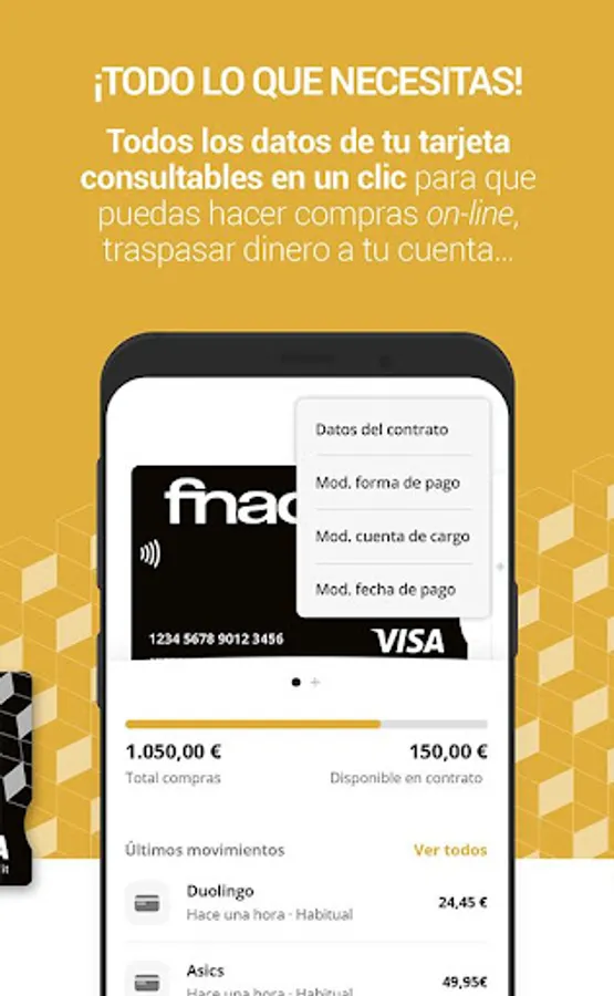 Expand the advantages of your VISA FNAC with the new FNAC Credit App that also allows you to pay with your mobile. You decide how and when to pay for your purchases, manage everything through the App and thus control your economy, without any surprises, with total comfort.