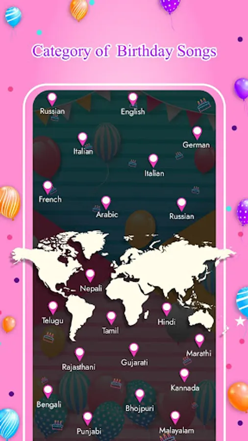 ☆ App is a collection of different languages birthday songs like English, Hindi, Arabic, Russian, French, German, Urdu, Nepali. It contains birthday songs of Indian languages like Tamil, Kannada, Telugu, Marathi, Bengali, Gujarati, Bhojpuri, Punjabi etc.