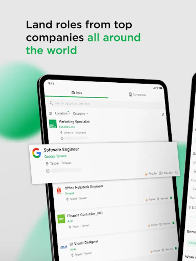 CakeResume connects millions of jobseekers worldwide with work opportunities in top companies in Taiwan (Google, TSMC, IBM, etc.), Indonesia (Bibit.id, Jiwa Group, Bank Mayapada, etc.) and many more accross the APAC region.