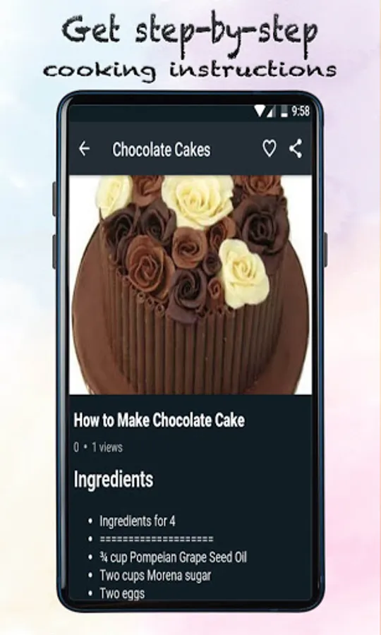 In this offline cake recipe, you find a simple chocolate cake recipe with step by step cake cooking instructions. Each recipe for the cake is very tasty and healthy to eat. Get homemade chocolate recipes through this chocolate cake recipe app and start cooking cake real recipe from today.