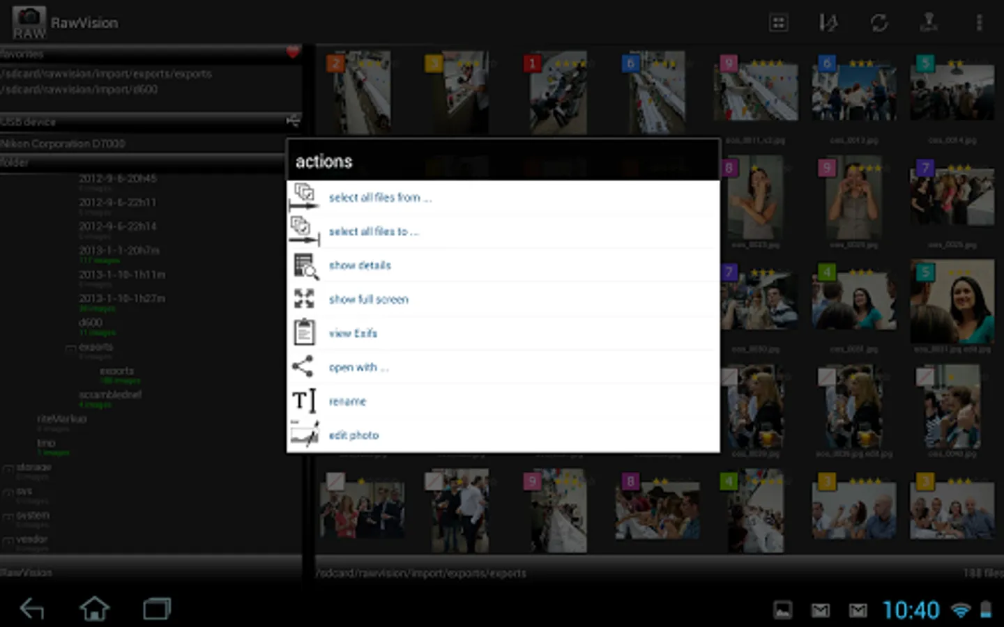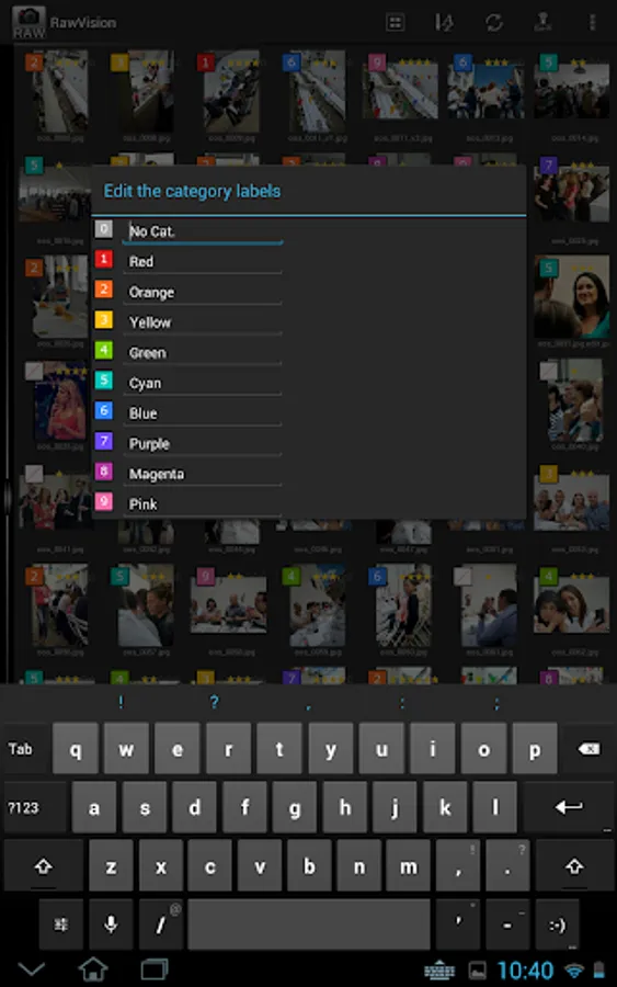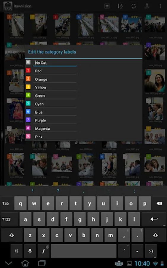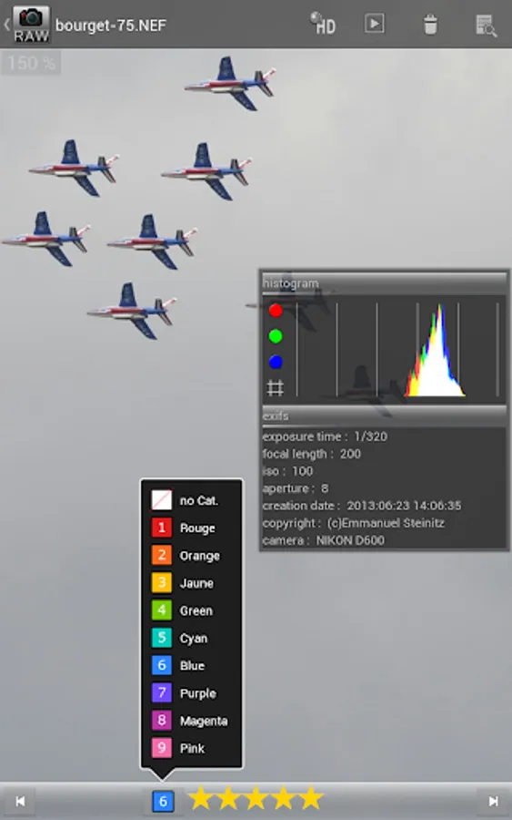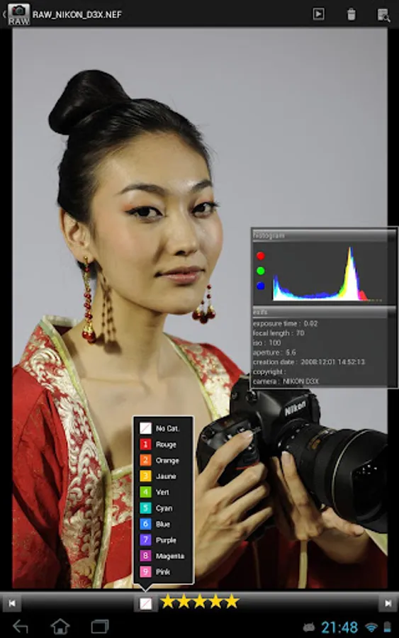 - Select a rating and category in full Ssreen to help sort photos. Import to LightRoom with the XMP sidecar files.