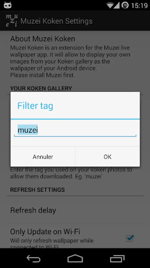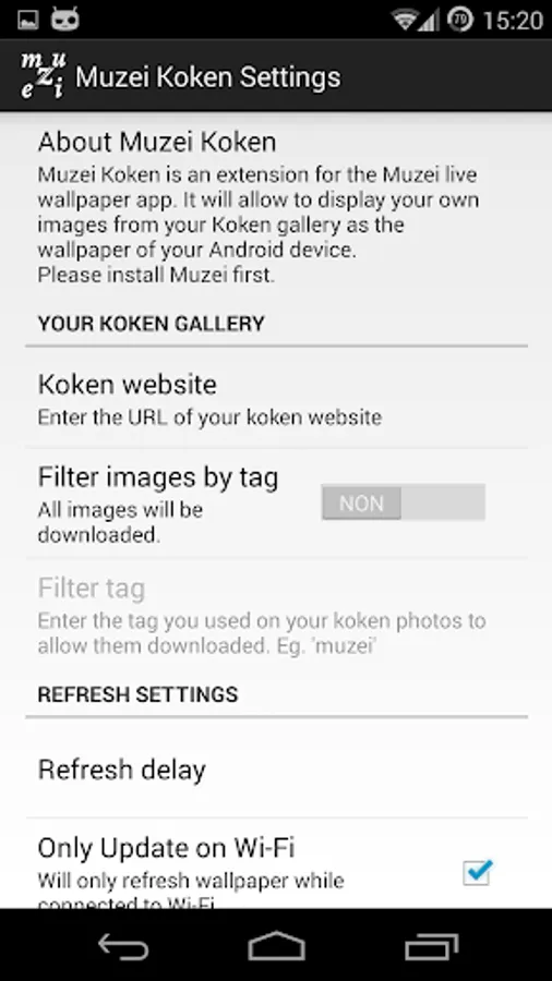Muzei Koken is intented for users of the great Koken CMS. Koken(http://koken.me) is a gallery management system for photographers or artists to organize your photos and albums and display them in a cool manner.