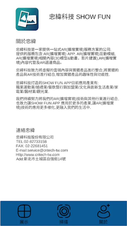 About page--Enter this page to learn more about SHOW FUN APP and Zhongwei Technology.