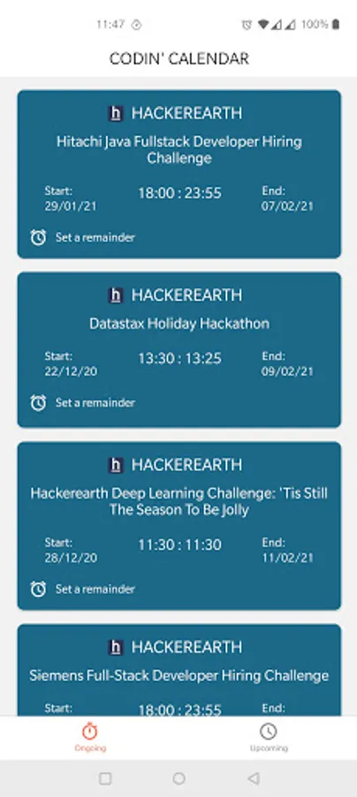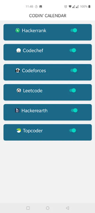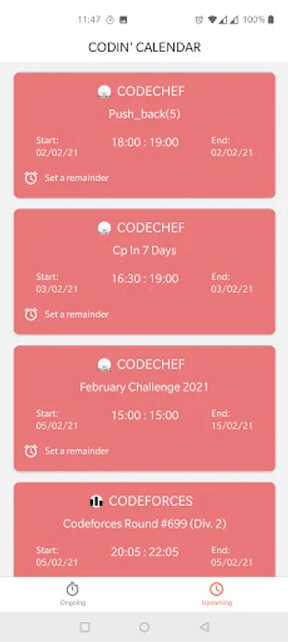 Features all the competitive coding events around all the popular platofrms like Codechef, Hackerrank , Hackerearth , Topcoder , Codeforces and many more.