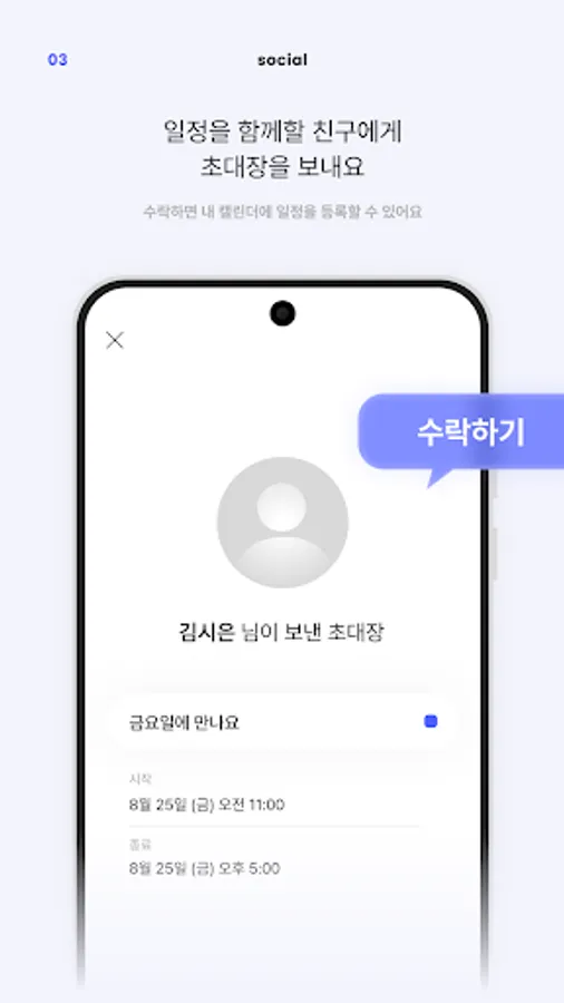 내 캘린더에서 개인 일정을 만들고 친구랑 약속을 잡아봐요. 재밌는 일정을 같이 참가하고 싶은 친구가 있으면 일정을 친구랑도 공유할 수 있어요.