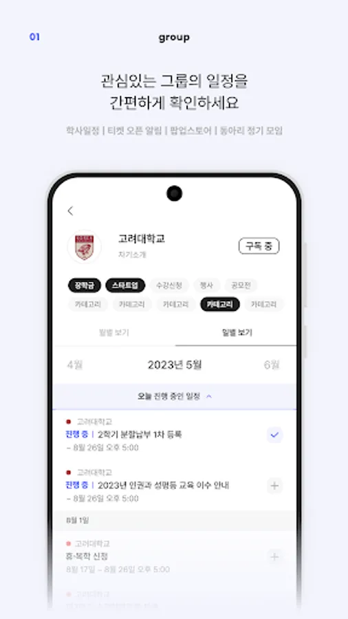 관심 그룹을 구독, 원하는 일정 저장, 일정 마간 전 알림 설정