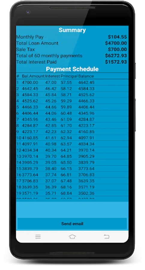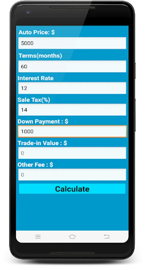 Auto Loan Calculator is a loan tool for Android to calculate monthly payments with Auto Price, Down Payment, Trade In, Interest Rate, and Terms. The application also provides summary of monthly payment, interest paid, etc.
