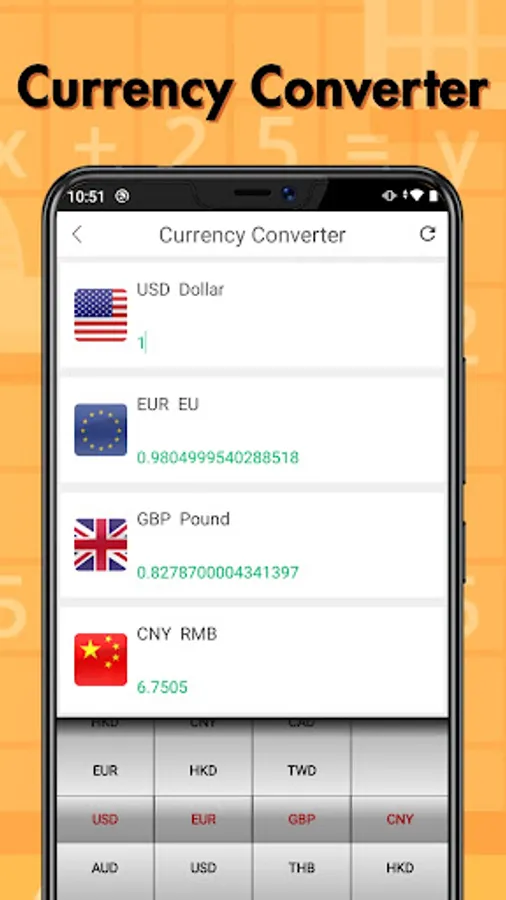Include 50+ currencies to convert, like dollar, euro, pound, yuan, yen, etc.