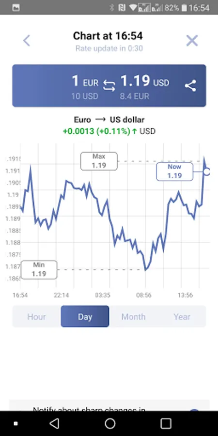 • Real-time chart of the exchange rate of any pair of currencies for the last hour, day, month and for the year.
