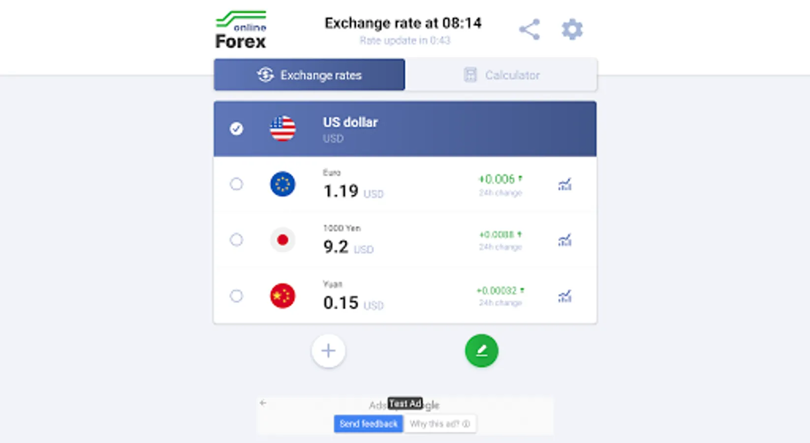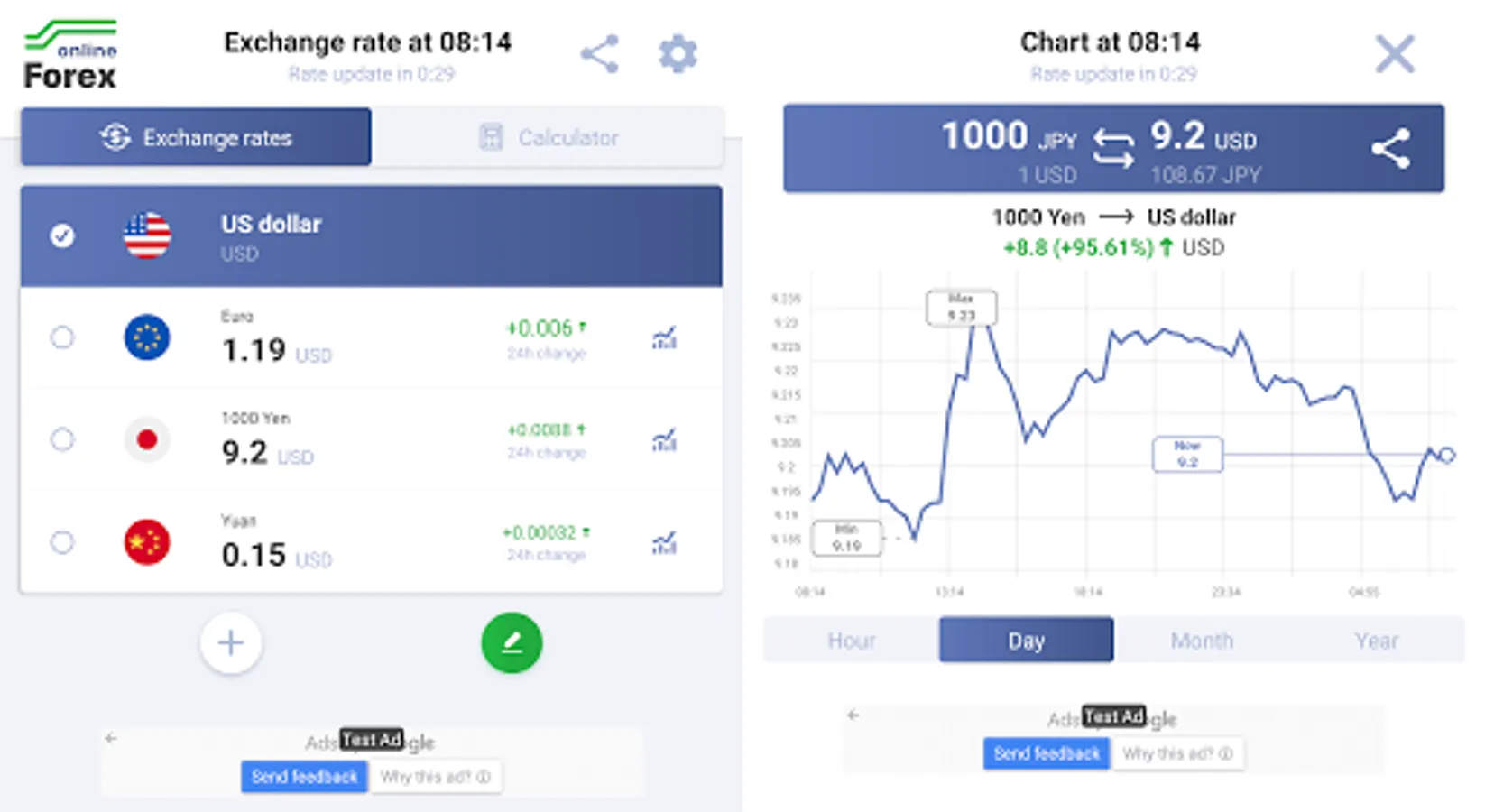 A separate widget shows the online rate and trend of the selected currency without opening the application.