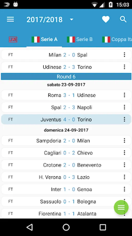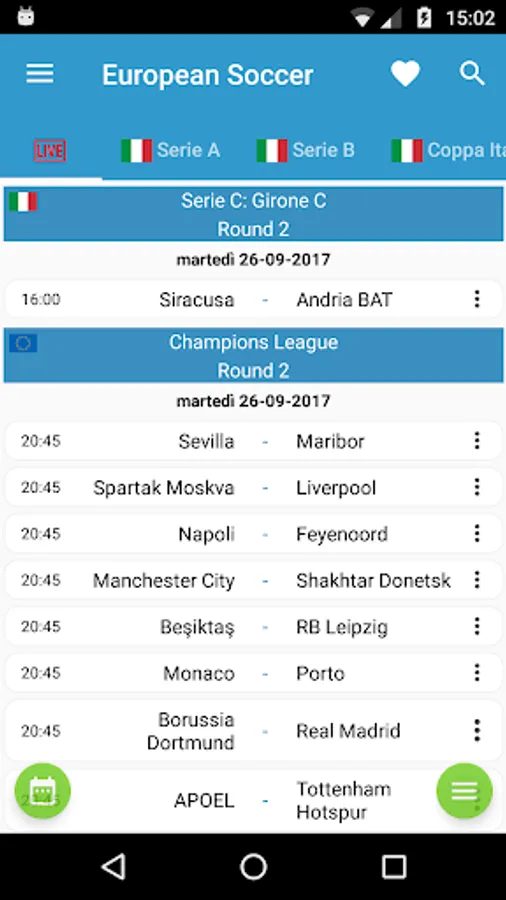 If the favorite team is set, all the games it play are displayed with a special background color. In addition, a calendar icon will appear on the team card to set up reminders for all team matches on your Google Calendar.