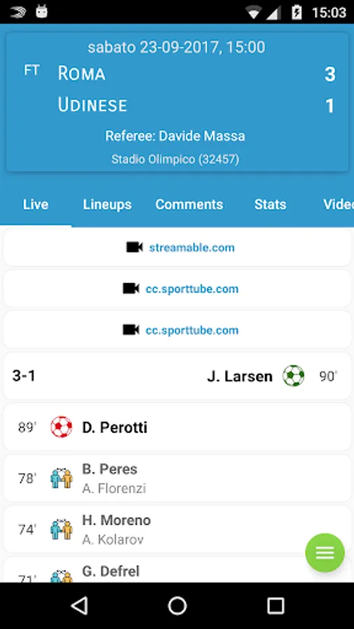 * Live: events of the game, such as goals, missed penalties, yellow and red cards.