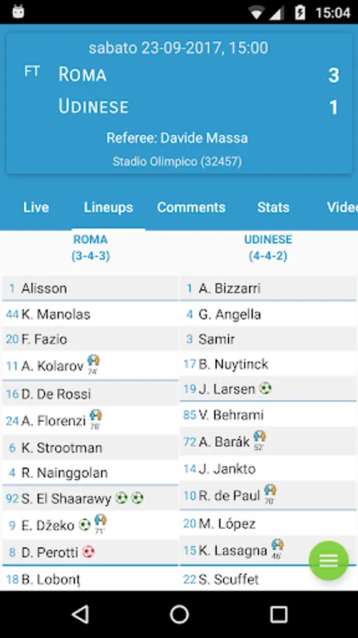 * Statistics: stats for the two teams on ball possession, shots, passes, fouls and cards.