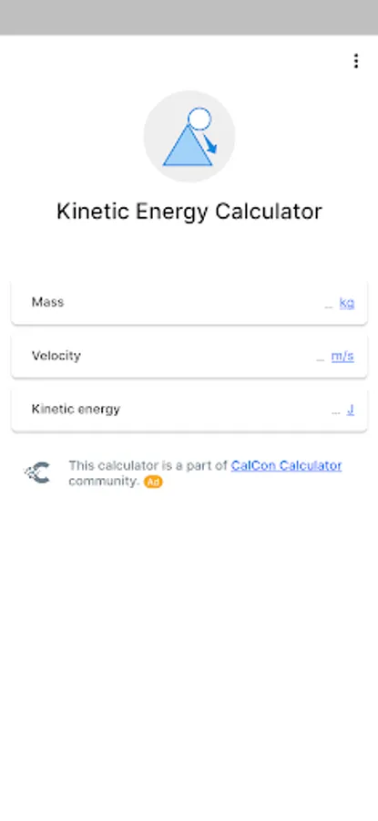 Kinetic energy is the energy a body possesses while it is in motion. The formula our calculator uses to calculate it is E=1/2m*v^2.