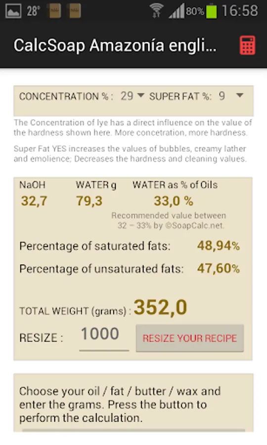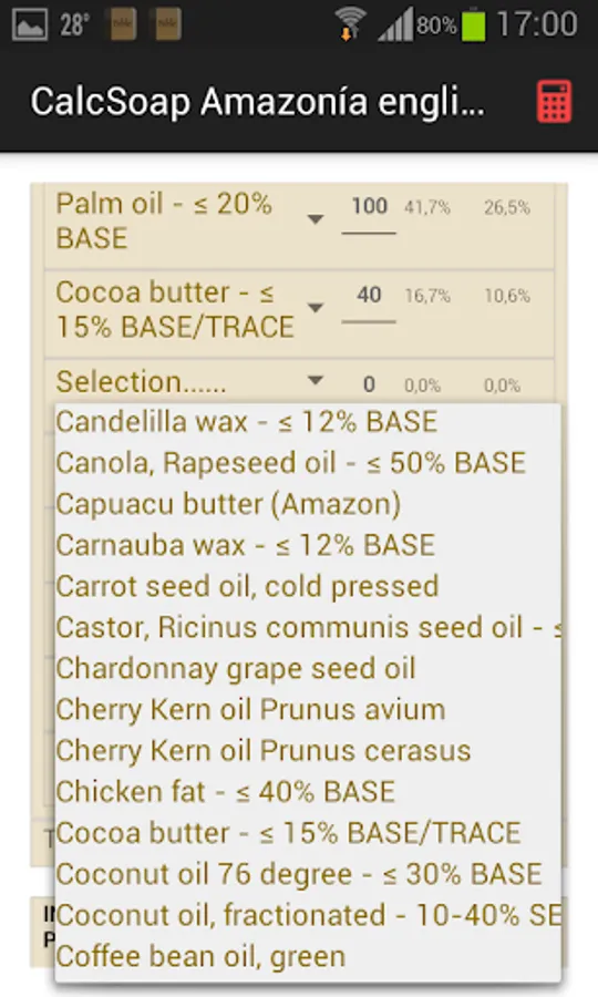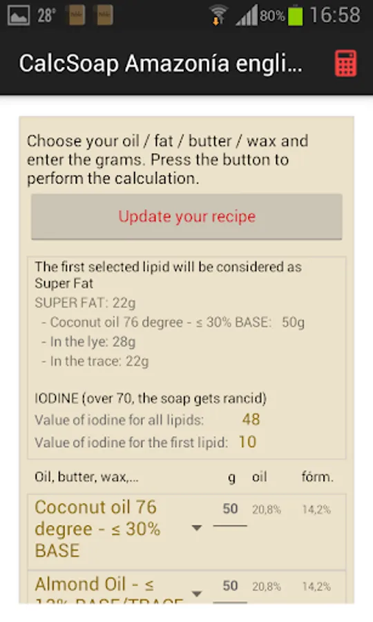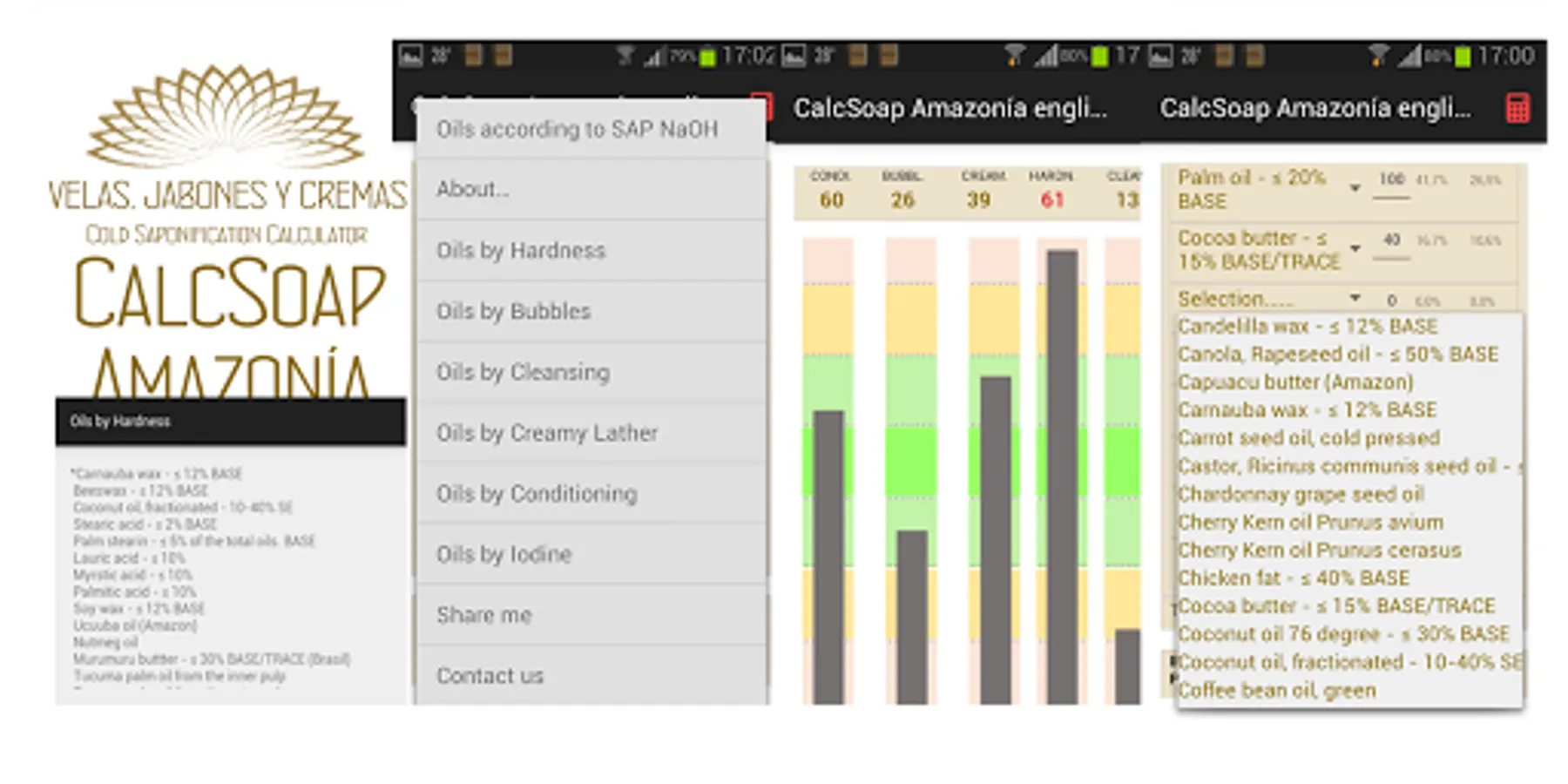 Reduced version of CalcSoap Amazonia in Spanish that includes more than 150 oils, fats and butters.