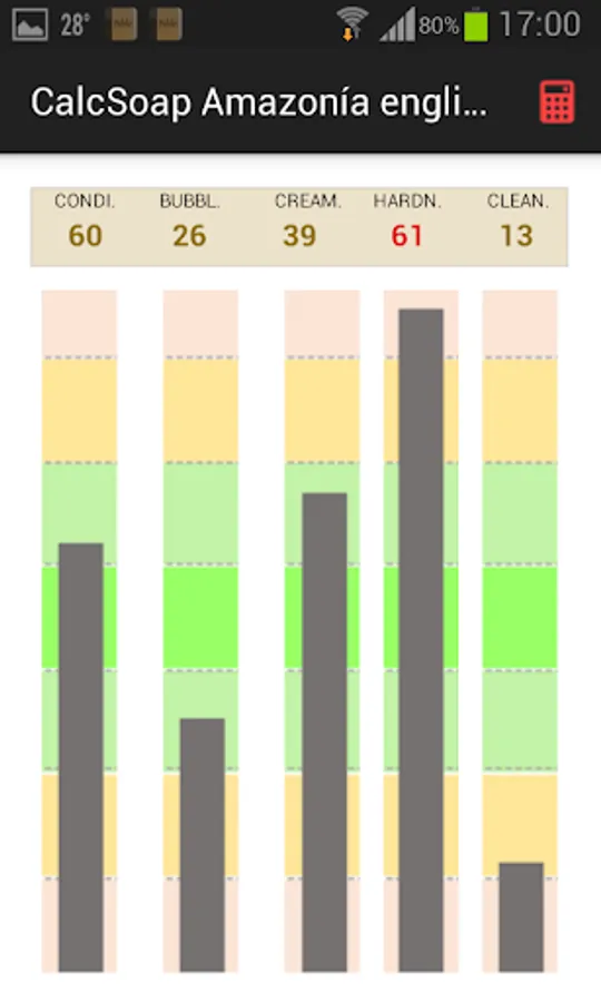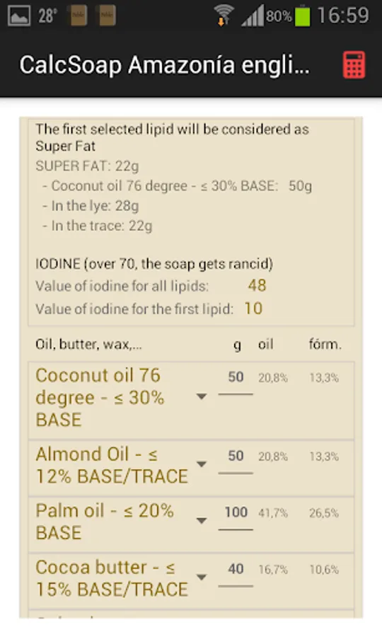 Calculator for cold saponification soap bars CalcSoap Amazonía in Spanish - includes ONLY 6 LIPIDS.