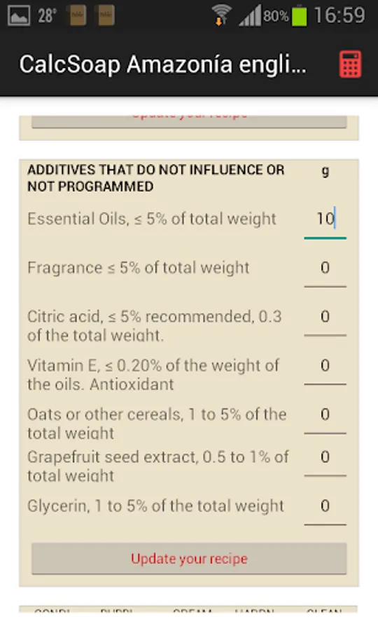Now with a section with additives that DO influence the properties of the soap, little by little we will be updating. There is also a section with additives that do NOT influence either because they do not modify the properties or because at the moment we do not have the calculations.