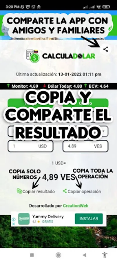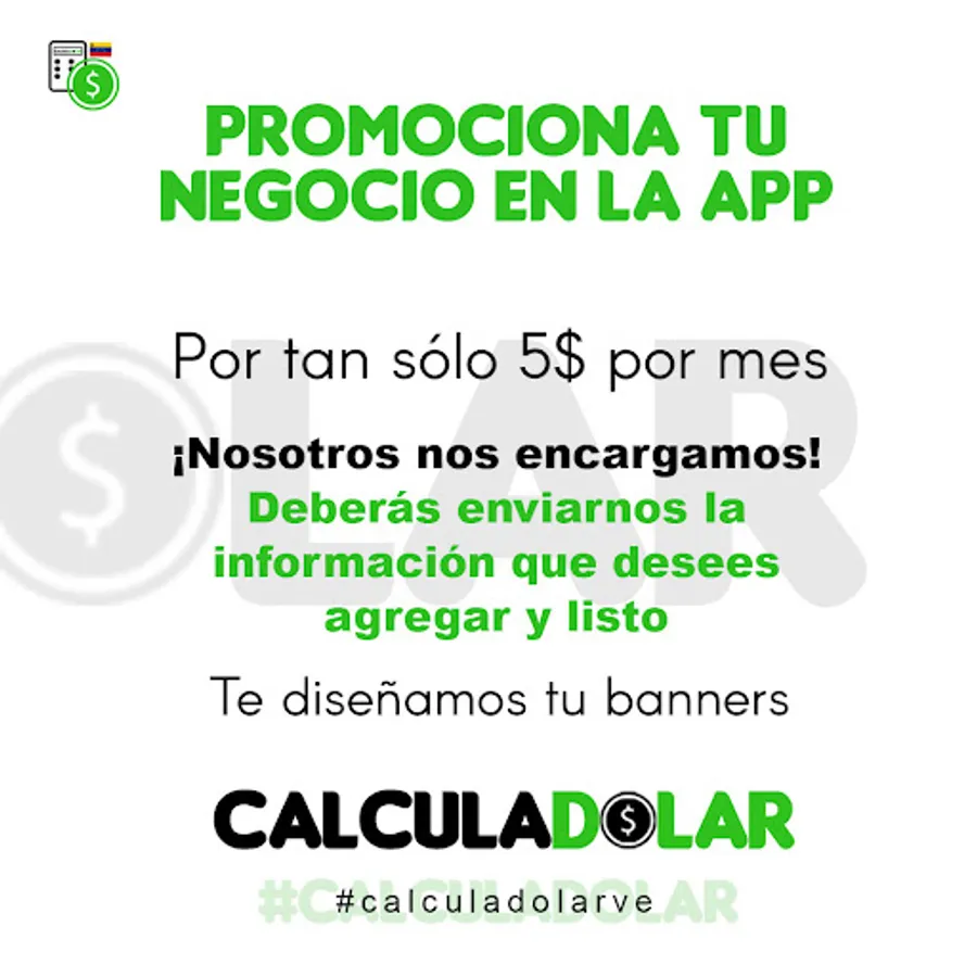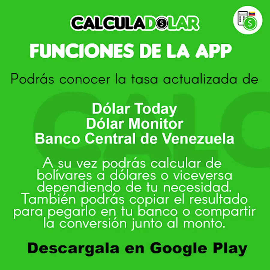 CalculaDolar is an app that seeks to provide a quick and easy solution in converting bolivars to dollars or vice versa compared to the different rates that are handled in the country. The references we use for conversions are from the following accounts (MonitorDolar @enparalelovzla) (DolarToday dolartoday.com) (Banco Central de Venezuela bcv.org.ve)