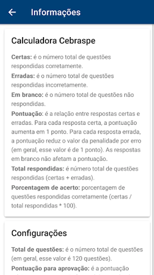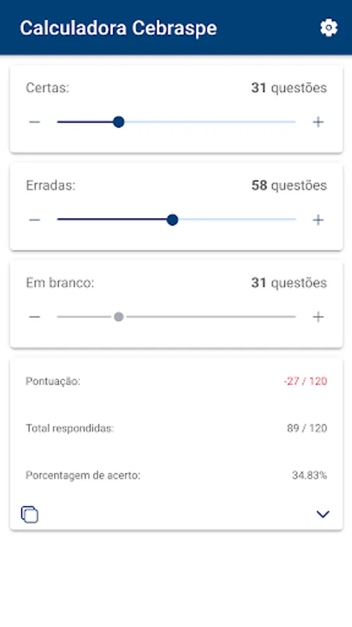 To use the application, you need to enter the number of questions in the test and the number of questions you got right and wrong. The application will calculate the user's total score and the percentage of correct answers, in addition to showing the number of questions answered, allowing the user to identify their strengths and weaknesses and to focus their studies on specific areas.