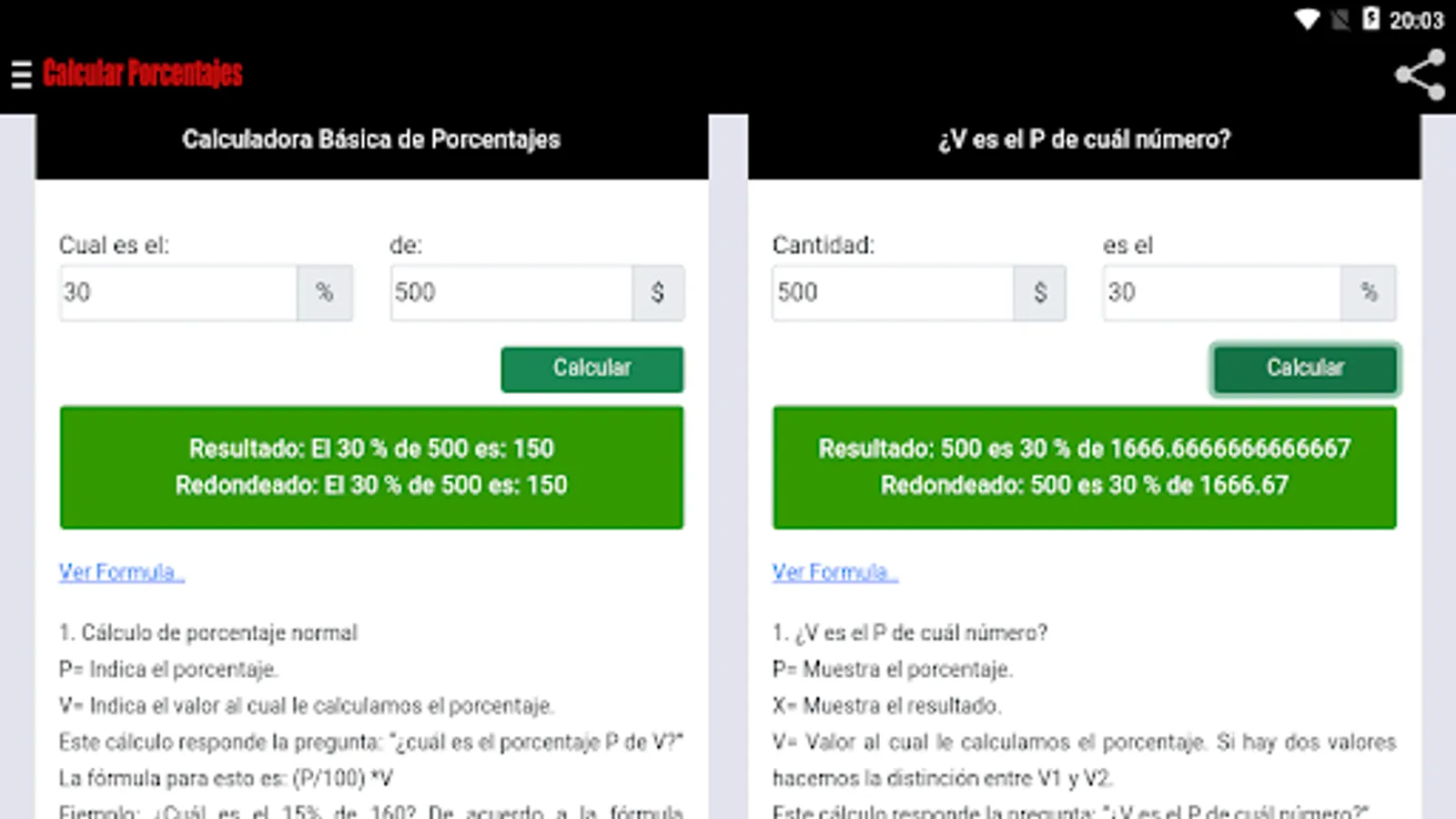 The application offers a simple control panel allowing you to choose the percentage calculation you want by sliding down you will find the other calculators and the definitions, formulas, uses etc. The results are obtained with complete and rounded decimals.