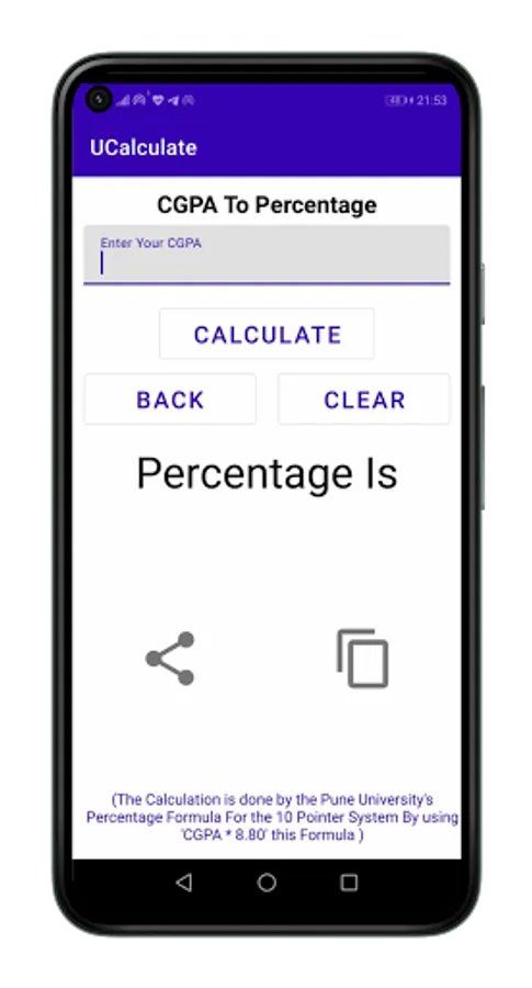 UCalulate is an Calculator for your all Daily Mathematical Problem's solution. It can be Used By Anyone like Student , Businessman. Here Calculation of the Simple Percentage, Discount tasks used by anyone frequently. Also For Educational Purpose Calculations like Marks to Percentage, CGPA To Percentage, Percentage To CGPA, SGPA To Percentage, Calculating SGPA. By using all the Calculation For the CGPA And SGPA is Done By All the Calculating Formulas Declared By University of Pune. For the Business Purpose Calculation like GST Calculation, Percentage Increase or Decrees, Profit Margin, Commission Percentage, EMI Calculation are also done in the app. The app is useful for anyone who hates calculation. All the necessary Instruction are given in the app For users Better Understanding. User can Share or Copy Data From the Application. All the Formula's for Calculating are taken from Google Recourse's.