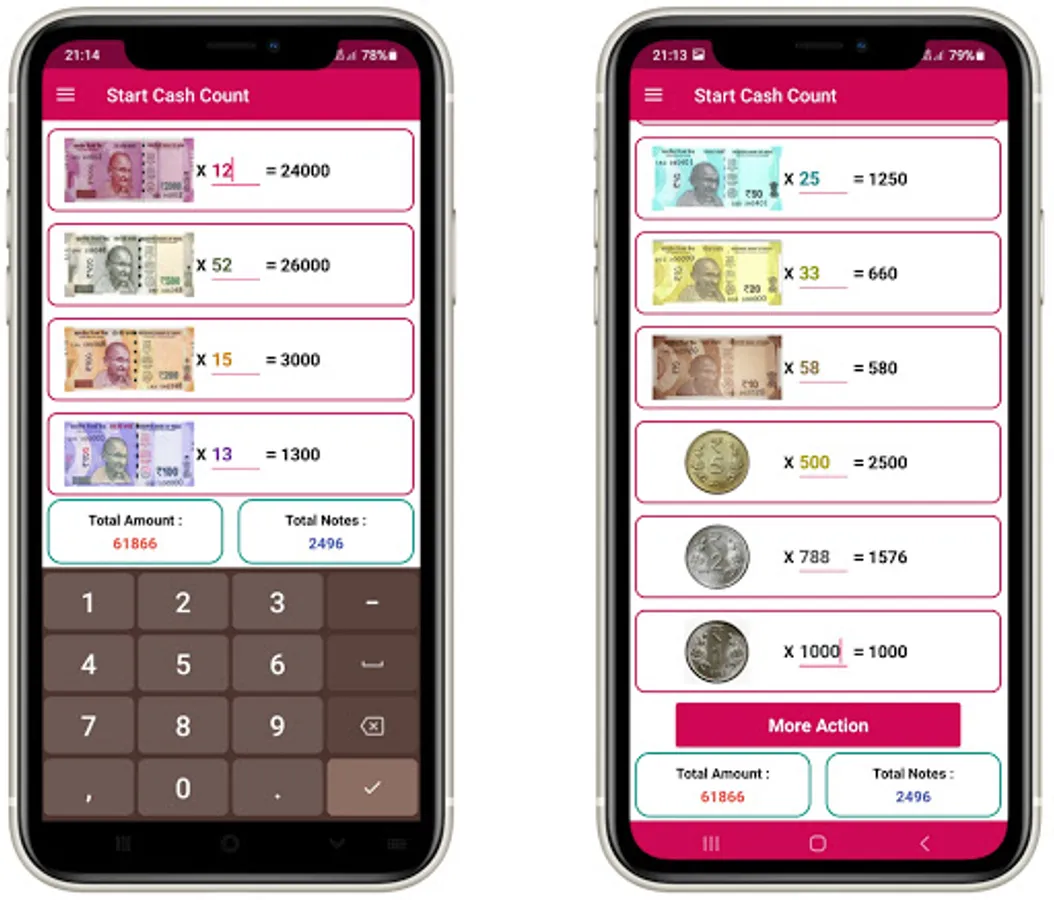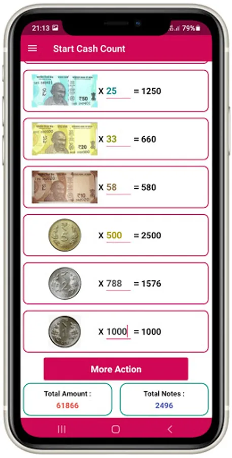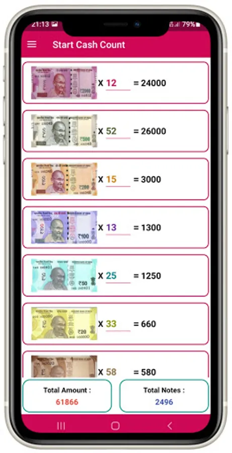 Features Available : Cash available from 2000 to 1 rupees for counting. Total amount feature available. Total Notes features also available for better understanding. History option available for saving current counted cash. It is a totally offline application. So Download now and enjoy the Application.