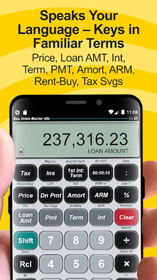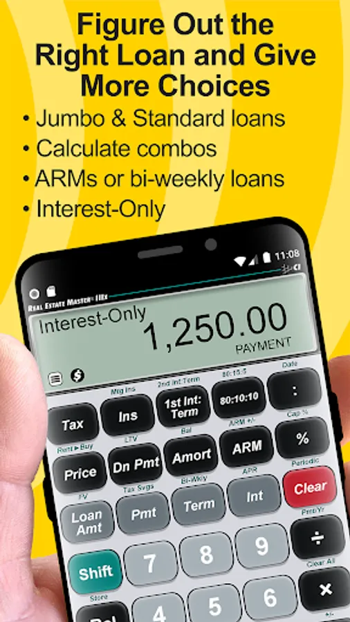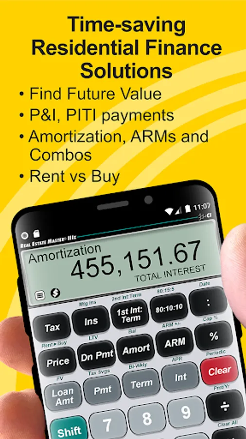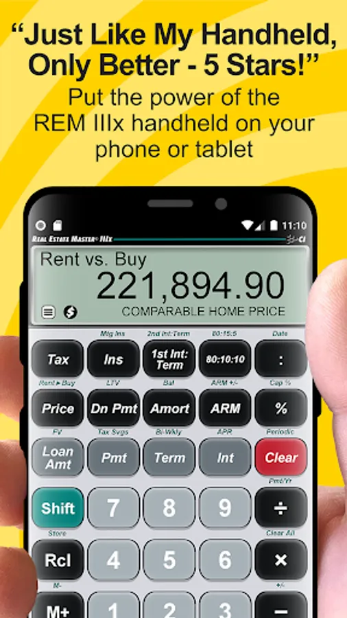 The Real Estate Master IIIx mortgage payment calculator app from Calculated Industries gives Real Estate professionals the power, portability and ease-of-use of the Real Estate Master IIIx calculator on your Android Smartphone. Calculate complete finance and mortgage payment solutions with mortgage insurance, amortization, FHA, ARMs, rent vs. buy comparisons and more.