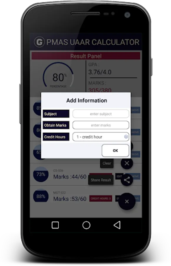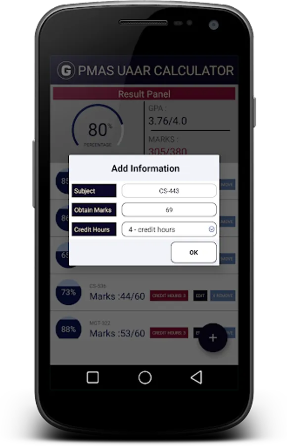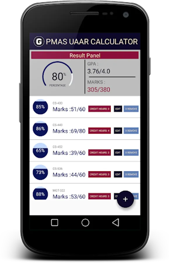 Simple, yet dynamic application that allows you to calculate your GPA for several semesters. Add course titles or Course Code, Credits and Obtain Marks . After adding all course details click Calculate Result which shows your GPA and total obtain marks.